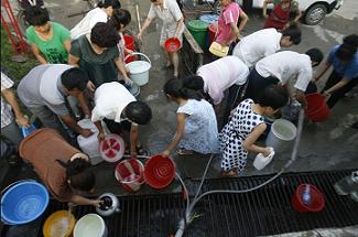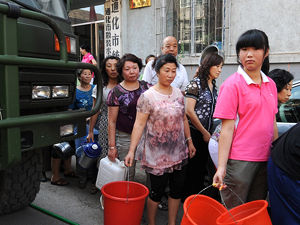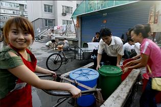 自7月31日被洪水沖斷自來水輸水管線至今,吉林省通化市全市停水已經(jīng)超過48小時(shí),市區(qū)33萬人面臨用水難題。消防部門和城建部門調(diào)運(yùn)25臺送水車,循環(huán)給居民送水,通化市隨處可見提著水桶找水的市民.