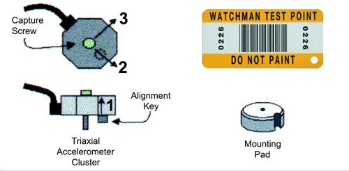 圖2.三軸加速度計組(左圖)的示意圖,其安裝在青銅盤安裝墊(右下)上。該集群包含三個加速度計,每個加速度計與其他加速度計相互垂直。使用條形碼激活振動數據采集,條形碼自動設置數據采集器,收集并存儲數據。